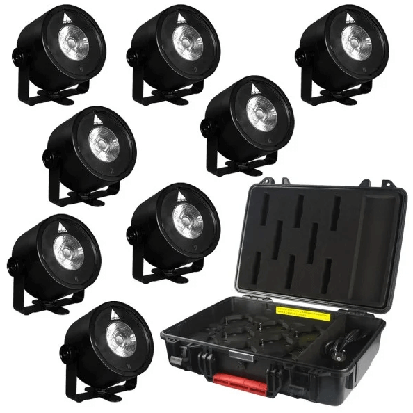8x AX3 LED 15W; 1x Charging Case; 8x Difusers Dome; 8x Difuser Filters Kit (3x filters: 30º, 120º, Wallwash); 8x Waterproof Protection Cover; 24x LightDrop Eyebolt; 1x AC Cable